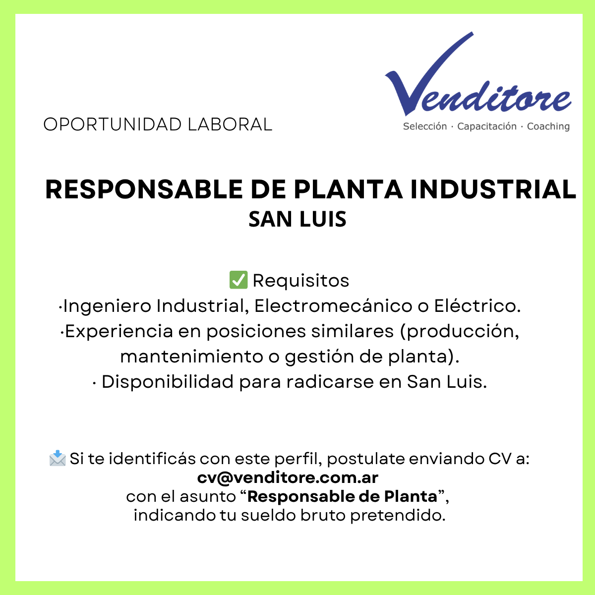 Estamos en la búsqueda de un Ingeniero Industrial, Electromecánico o Eléctrico, con disposición para radicarse en San Luis. ⚙ Responsabilidades Principales Dirigir y supervisar las operaciones diarias de producción. Organizar, …
